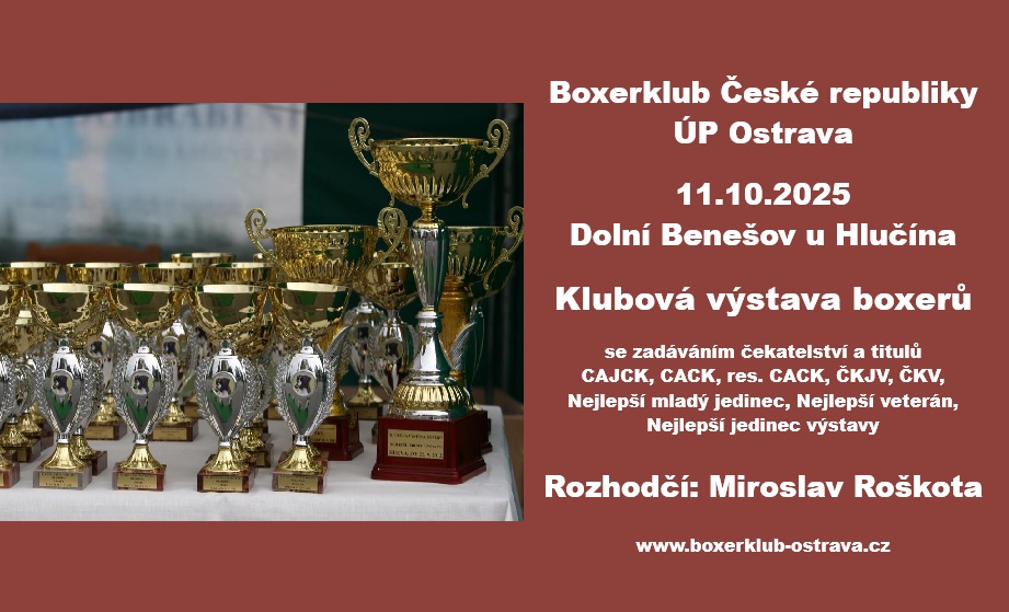 Plánovaná klubová výstava boxerů, která se měla konat dne 10.10.2026 byla ZRUŠENA.
